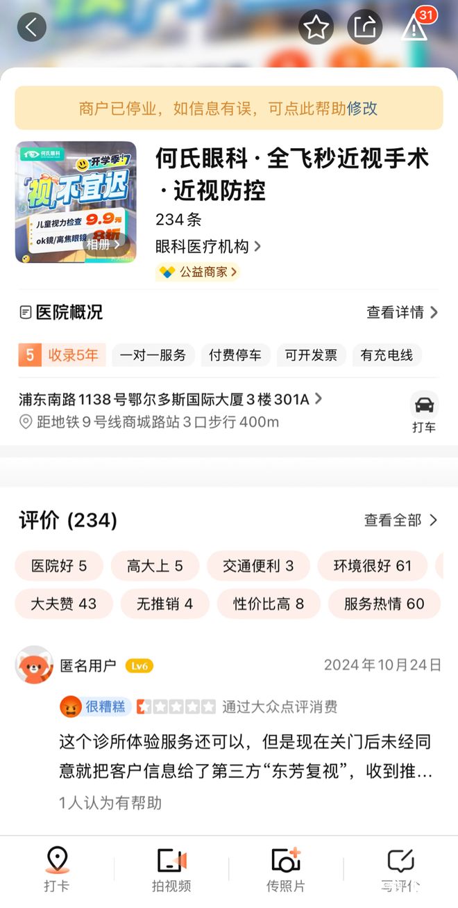 另外,今年5月9日有消费者发现,大众点评平台显示,位于浦东南路的何氏眼科上海医院也已停业。