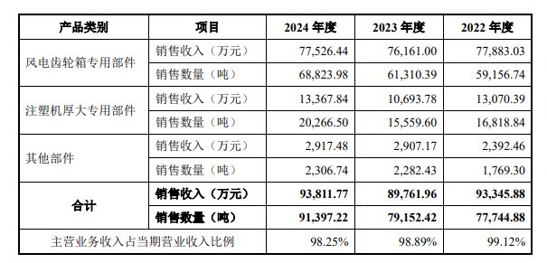 数据显示,2022—2024年,锡华科技来自前五大客户的收入占主营业务收入的比例分别为99.17%、97.44%和97.87%。其中来自全球风电齿轮箱制造龙头南高齿集团的收入占主营业务收入比例分别为48.91%、59.53%和60.02%。